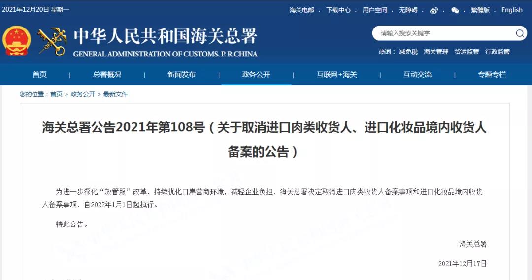 2021年12月17日,海关总署发布2021年第108号公告:为进一步深化“放管服”改革,持续优化口岸营商环境,减轻企业负担,海关总署决定取消进口肉类收货人备案事项和进口化妆品境内收货人备案事项,自2022年1月1日起执行。