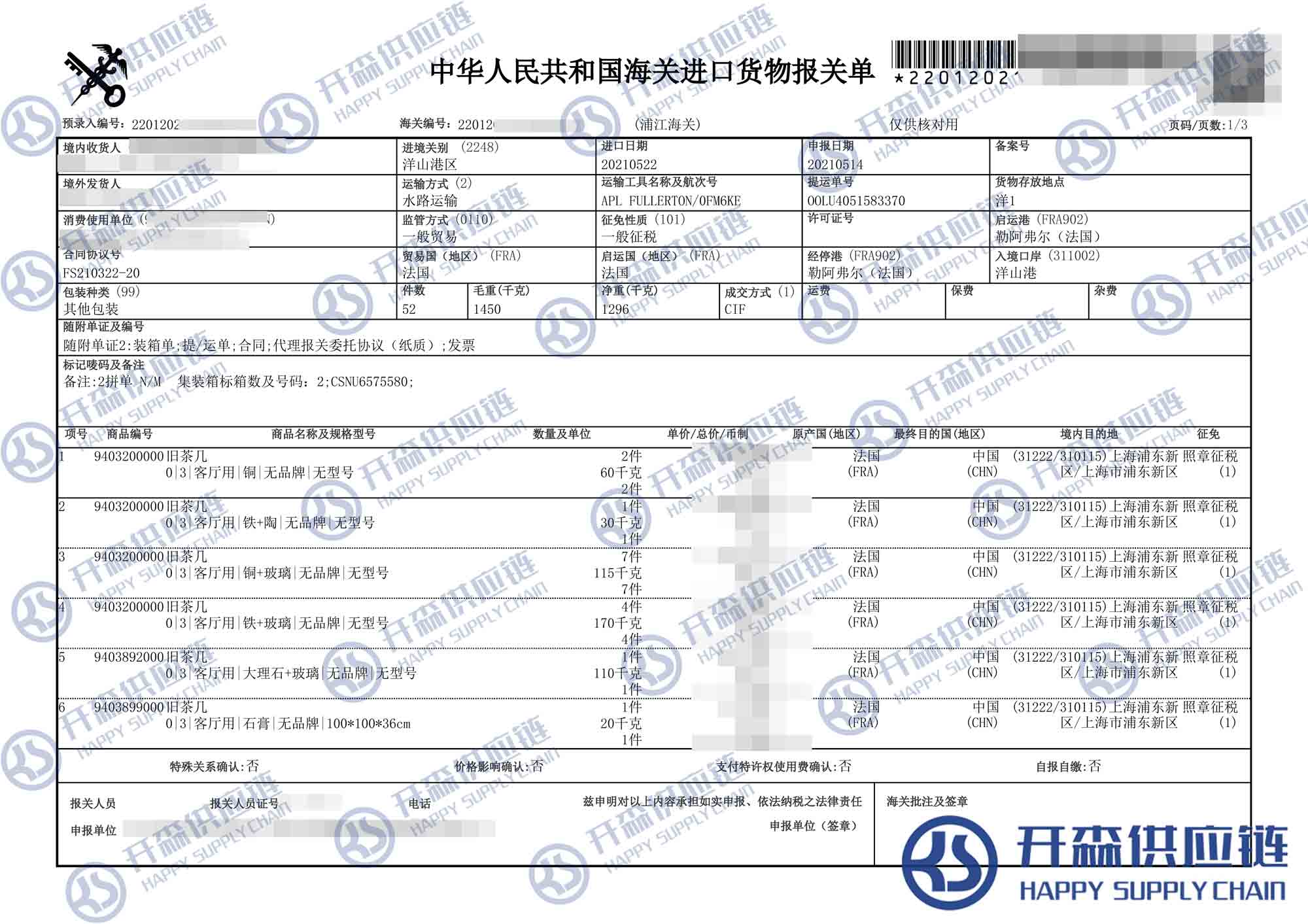 【本文结语】 上述就是法国二手旧茶几家具进口报关代理案例【经典案例】的全部内容,希望能对您有所帮助,如有二手家具进口报关上任何疑问及问题可随时在线联系我们或拨打 18002611553,九游娱乐app官方入口供应链拥有丰富的二手家具进口报关操作经验及案例,10余年进口经验为您所用,各类进口疑难都能为您一一解答及协助快速处理解决!