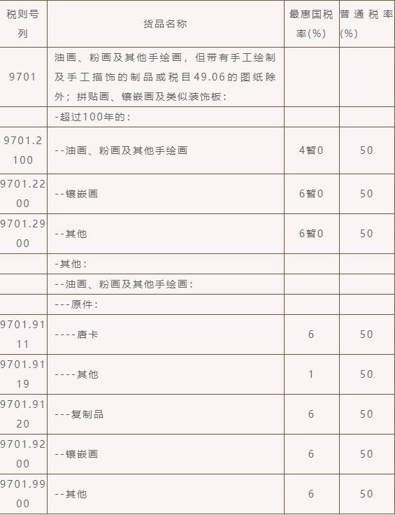 根据《中华人民共和国进出口税则(2022版)》,绘画作品的税则号列和部分税率如下(协定税率及特惠税率等详见2022年税则):