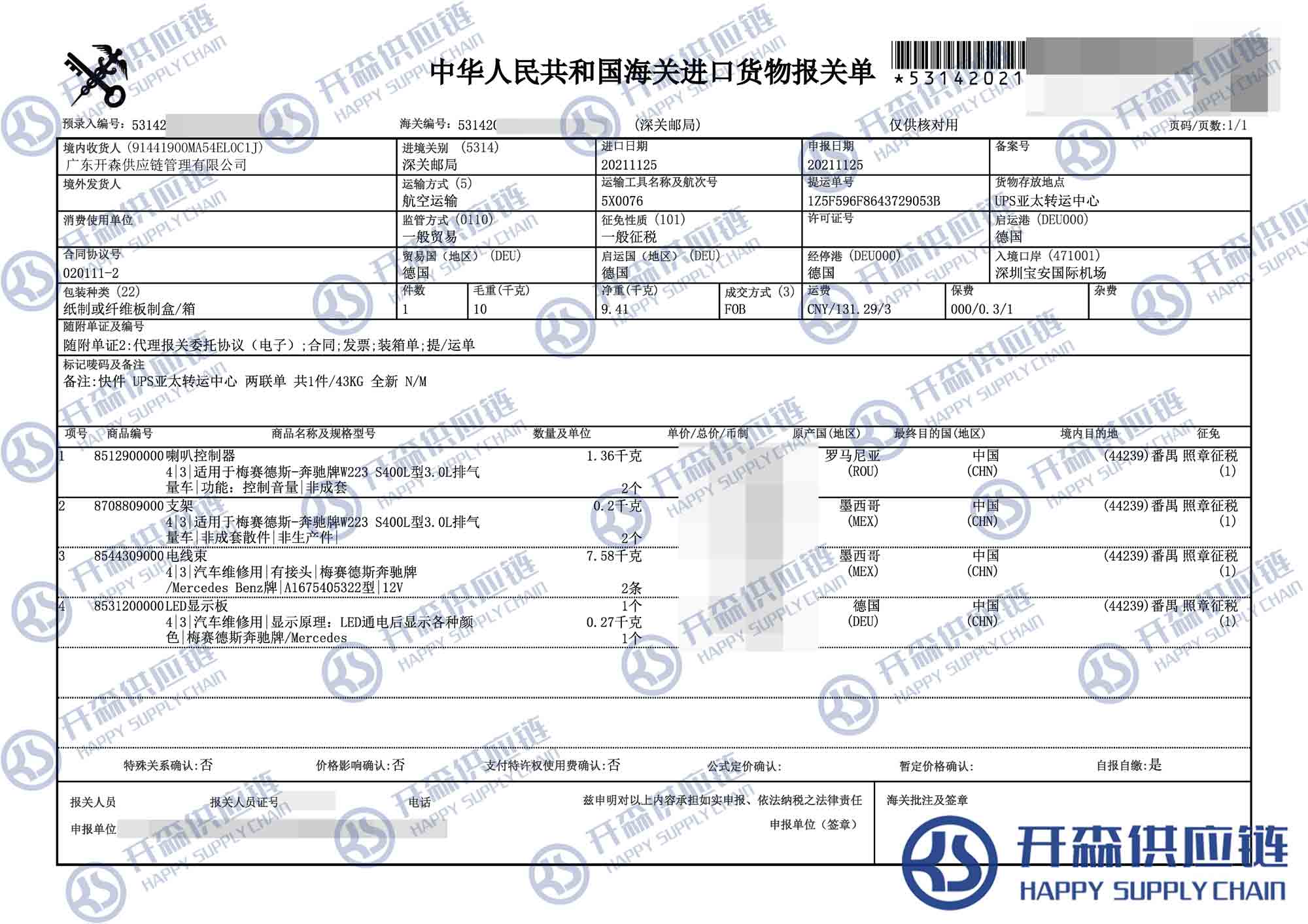 【本文结语】 上述就是喇叭控制器汽车配件进口报关代理案例【进口案例】的全部内容,希望能对您有所帮助,如有汽车配件进口报关上任何疑问及问题可随时在线联系我们或拨打 18002611553,九游娱乐app官方入口供应链拥有丰富的汽车配件进口报关操作经验及案例,10余年进口经验为您所用,各类进口疑难都能为您一一解答及协助快速处理解决!