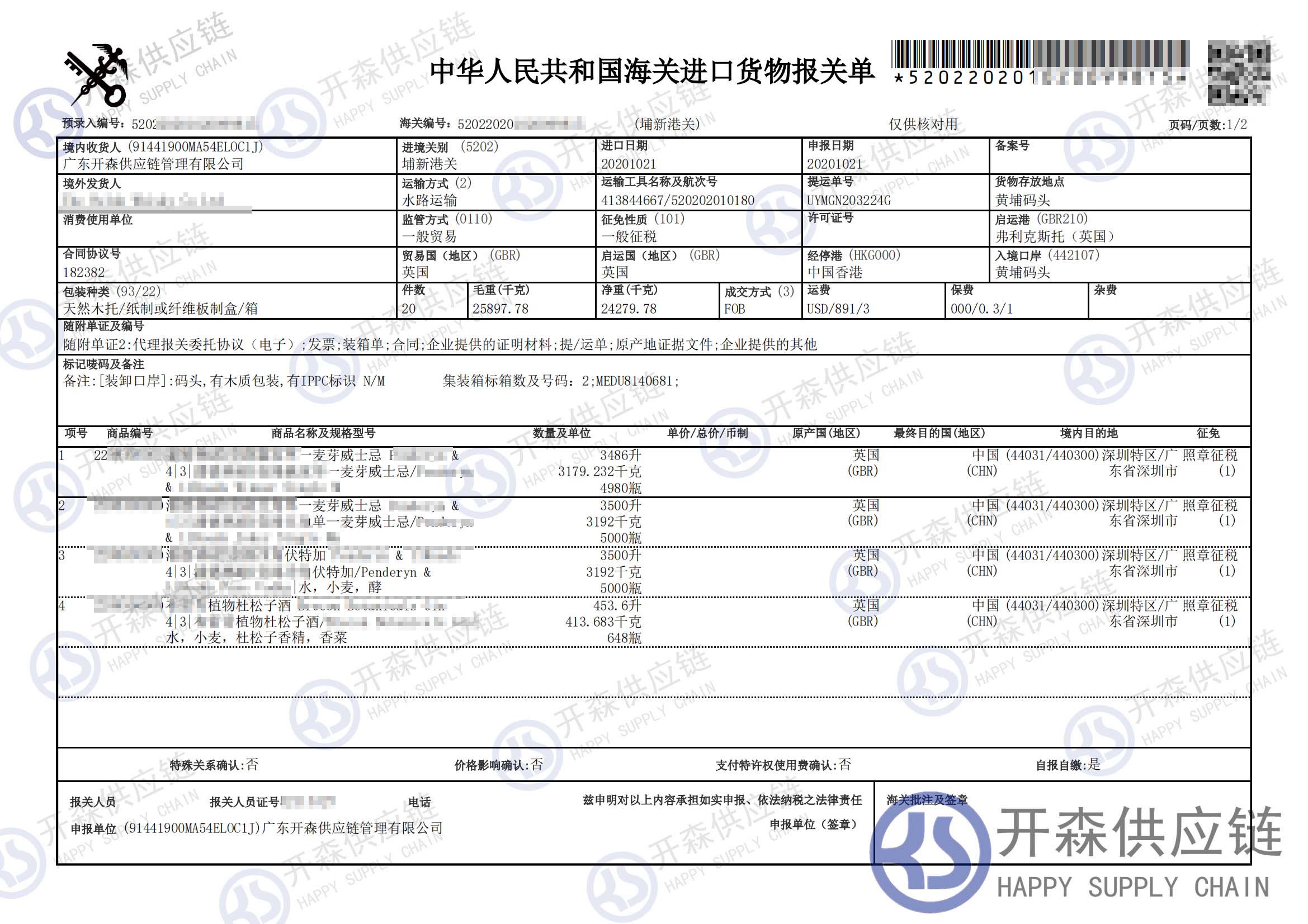 从英国威尔进口一批威士忌等酒到黄埔码头,我司提供门到门进口一站式清关服务,九游娱乐app官方入口拥有十余年食品进口清关经验及案例,为客户提供量身制作的进口方案,让客户进口省时省心省成本。
