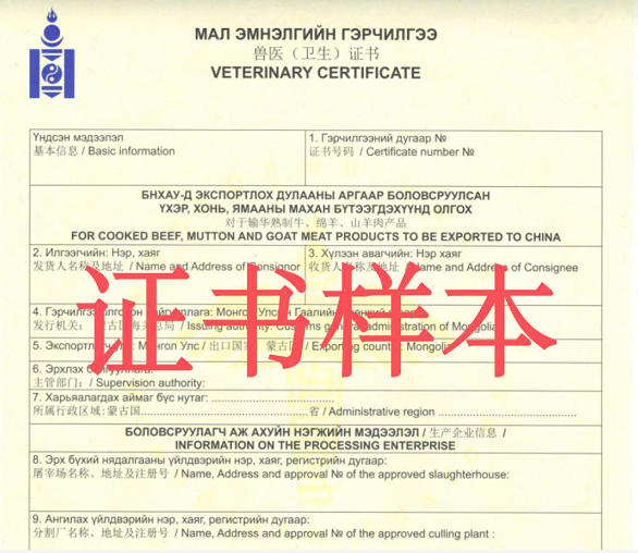 蒙古国官方已向中国海关总署备案确认蒙古国熟制牛羊肉产品兽医卫生证书样式、官方印章及官方兽医签字等相关信息。进口蒙古国熟制牛羊肉产品应附有蒙古国官方出具的兽医卫生证书,并加盖官方印章和官方兽医签字,同时向中国海关推送对应蒙古国输华肉类卫生证书电子信息。