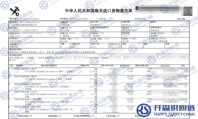 【本文结语】 上述就是广州机场意大利油画进口报关代理服务【清关案例】的全部内容,希望能对您有所帮助,如有油画进口报关上任何疑问及问题可随时在线联系我们或拨打 18002611553,九游娱乐app官方入口供应链拥有丰富的油画进口报关操作经验及案例,10余年进口经验为您所用,各类进口疑难都能为您一一解答及协助快速处理解决!